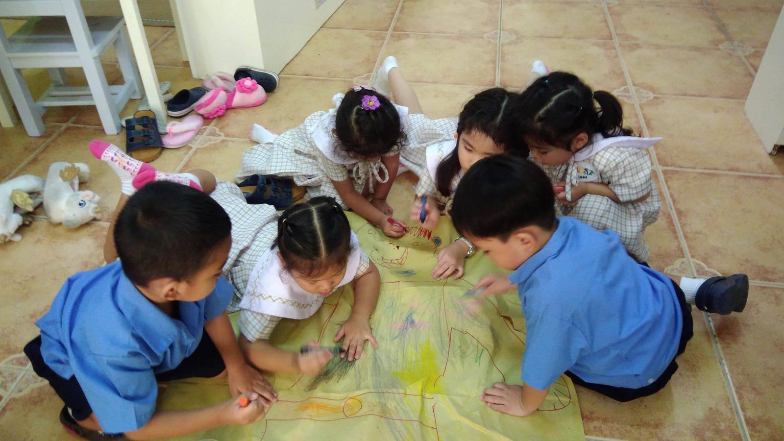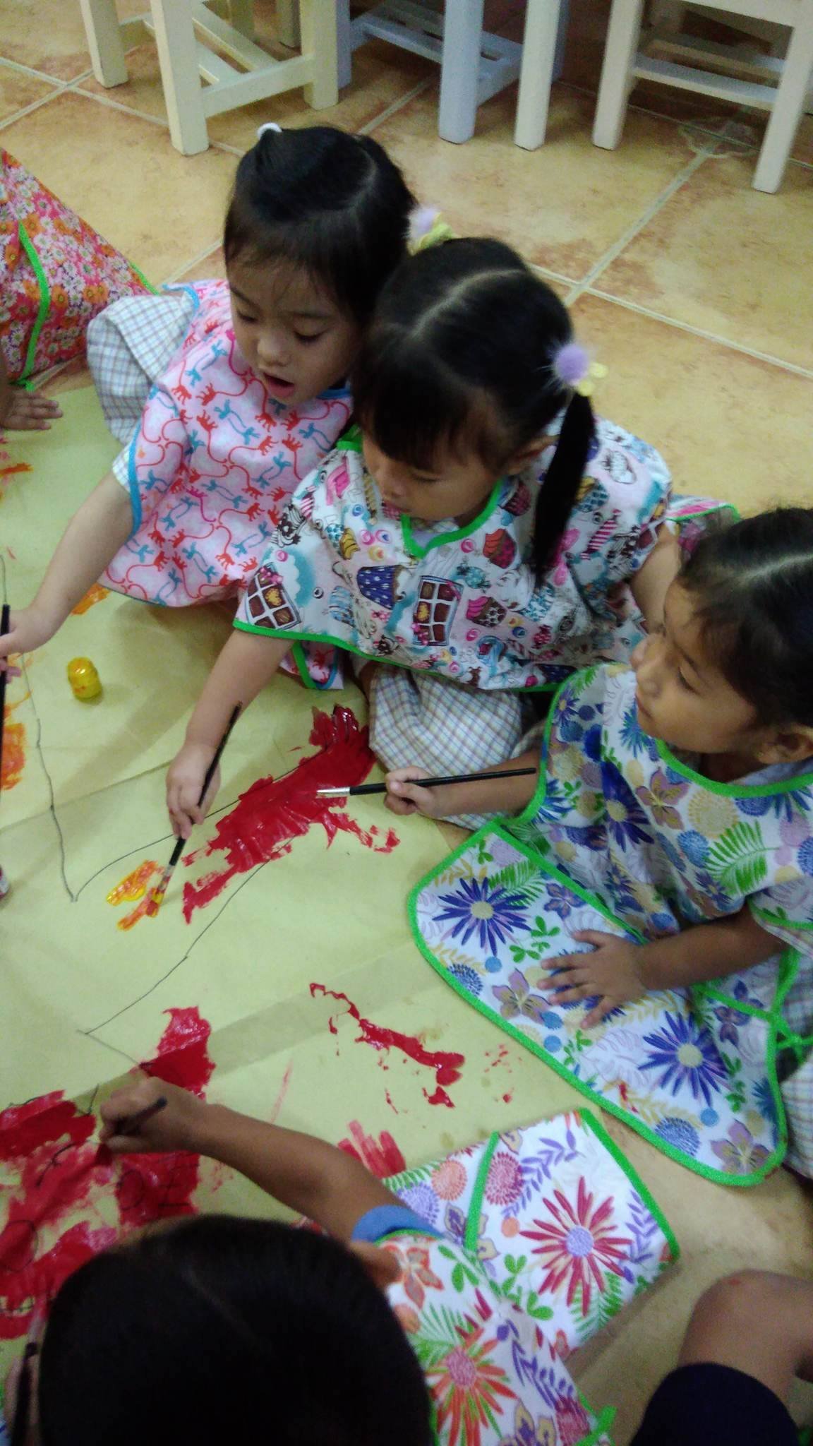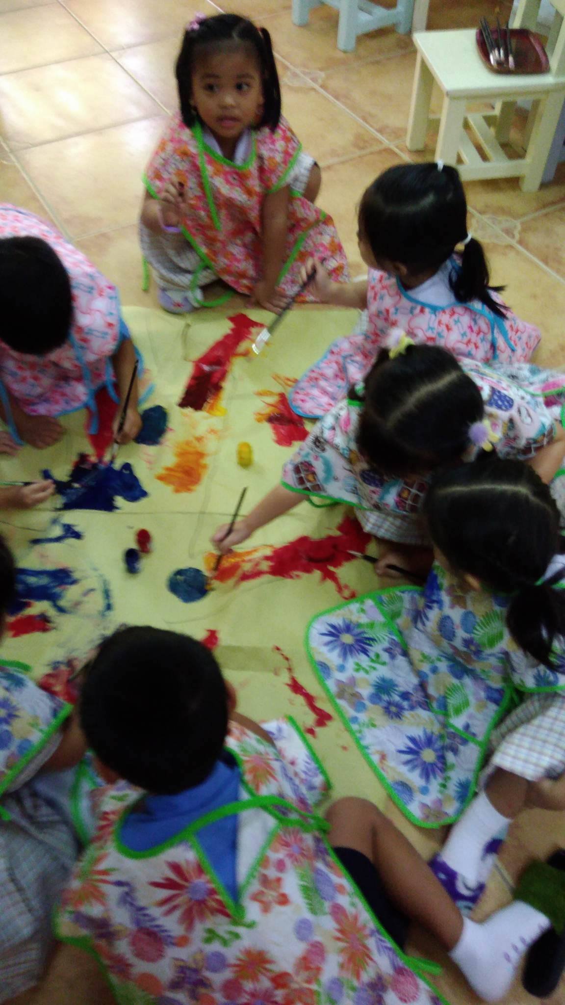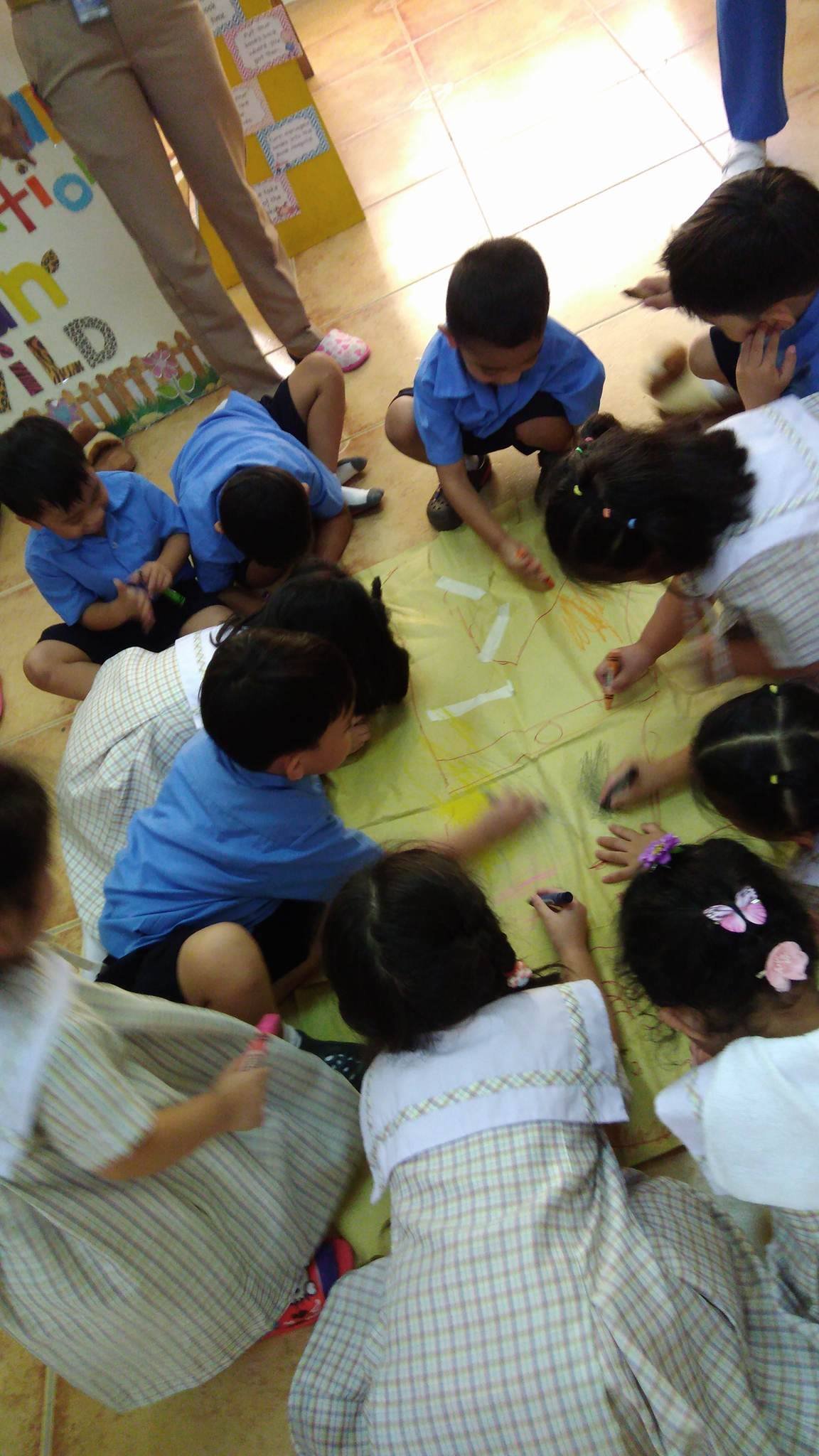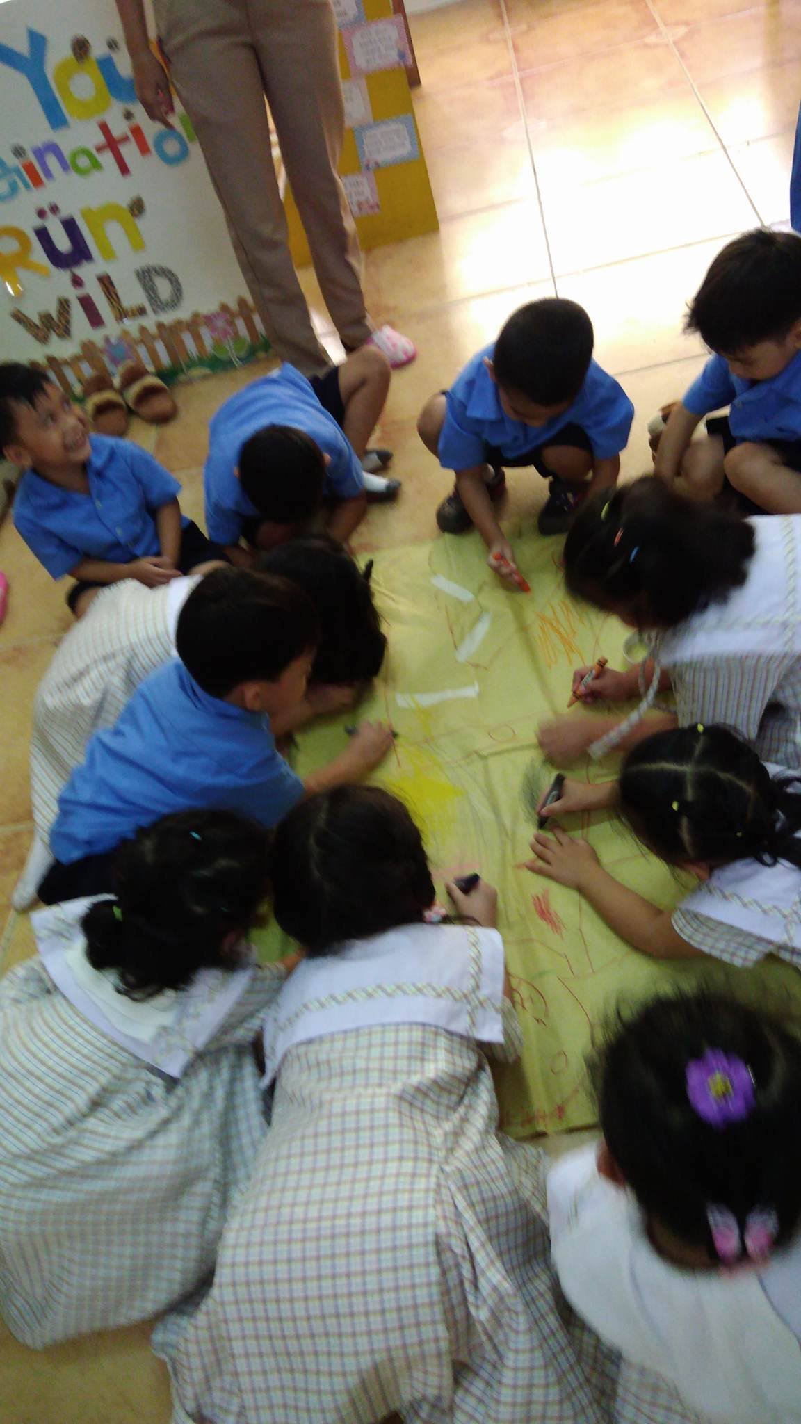 Teacher Aljean intentionally planned the day’s session by giving an interactive learner-centered activity on the concept of “Parts of the Body”. She made use of blank manila papers, markers and other coloring materials. She grouped the class and with her assistance, each group traced the actual body of a specific member. After the body has been traced, the group drew and named its parts according to how they see it in their classmate’s body.