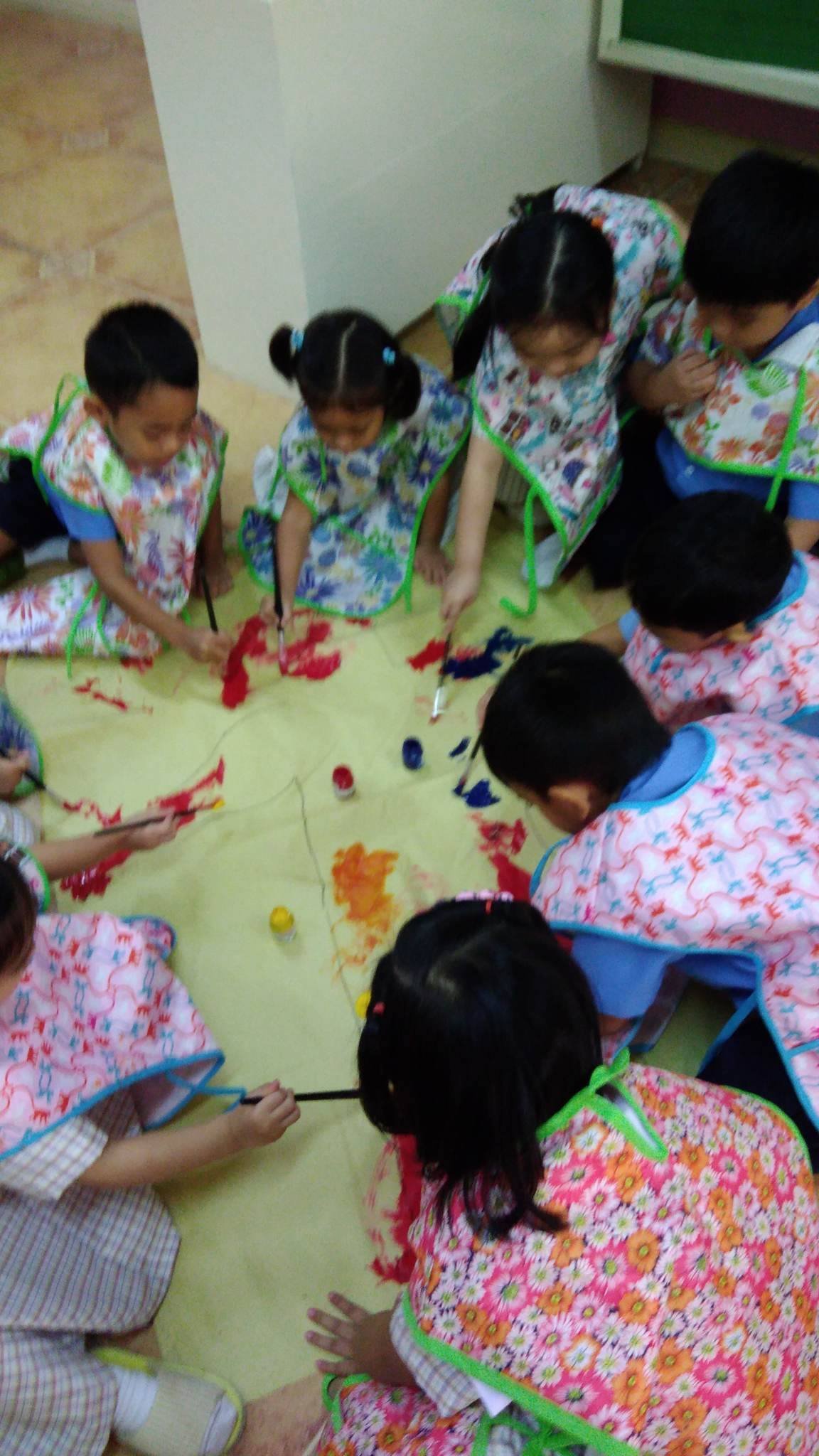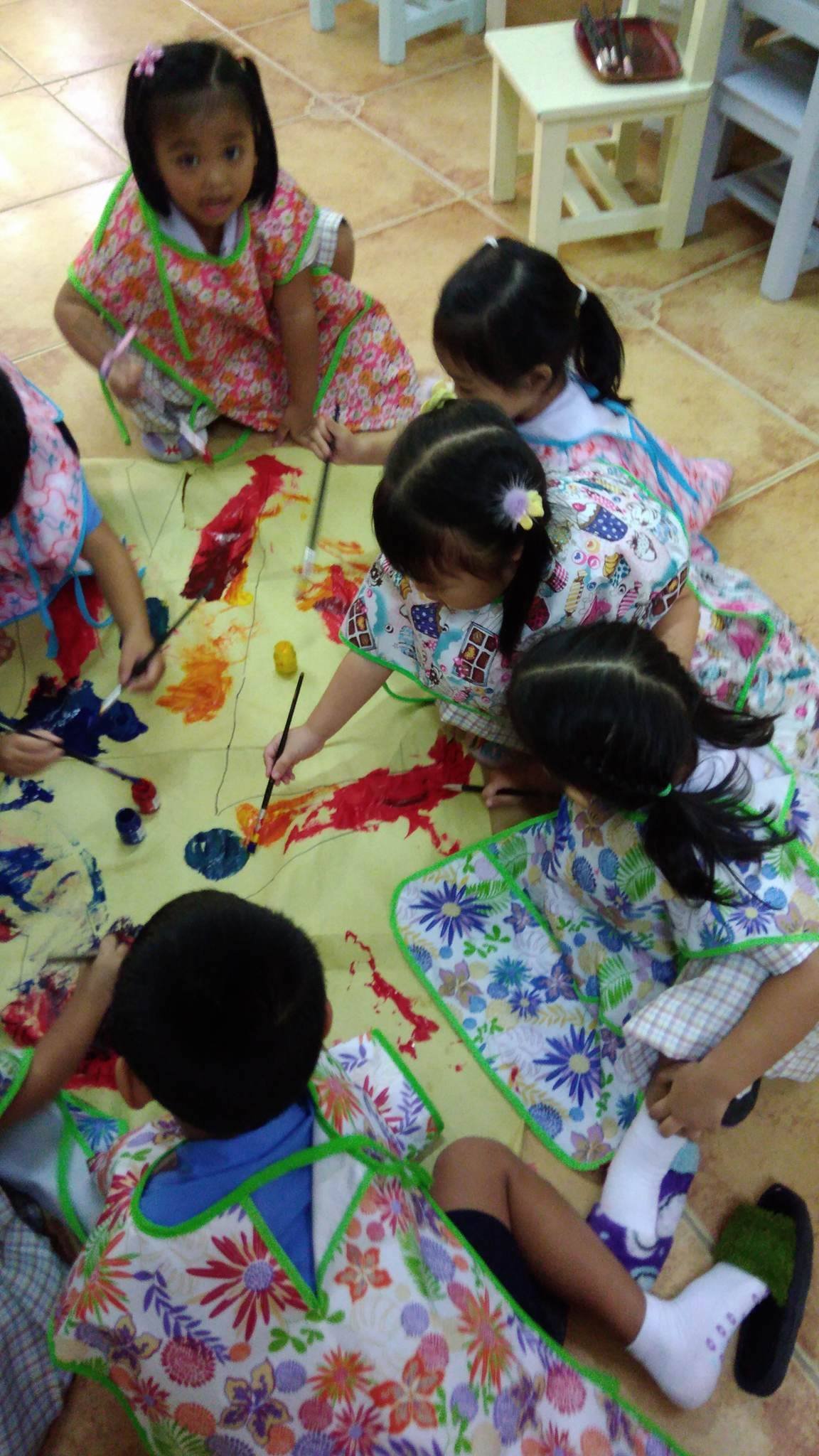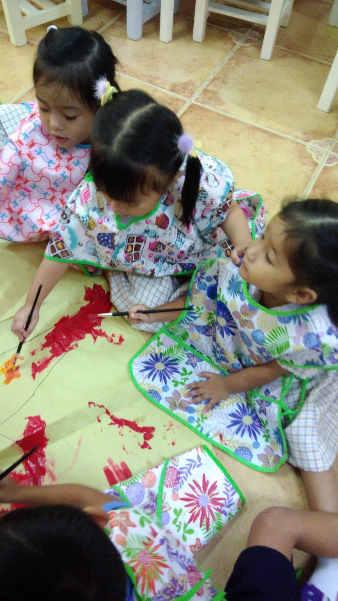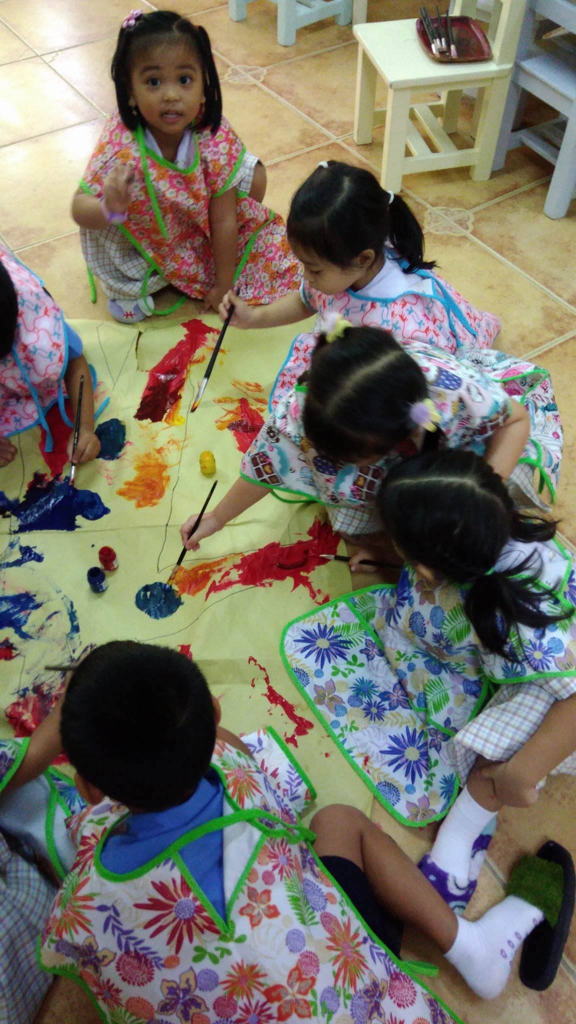 Teacher Aljean intentionally planned the day’s session by giving an interactive learner-centered activity on the concept of “Parts of the Body”. She made use of blank manila papers, markers and other coloring materials. She grouped the class and with her assistance, each group traced the actual body of a specific member. After the body has been traced, the group drew and named its parts according to how they see it in their classmate’s body.