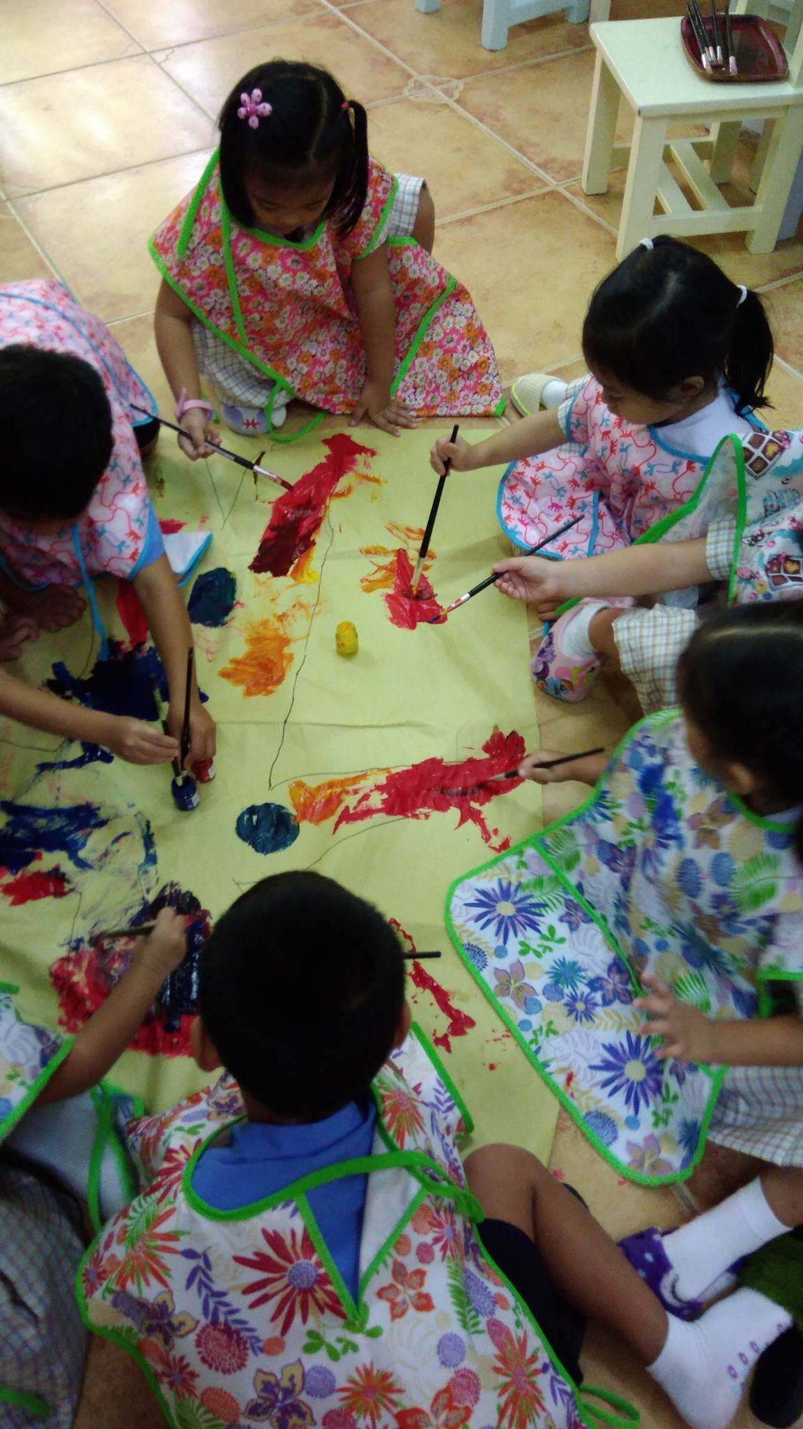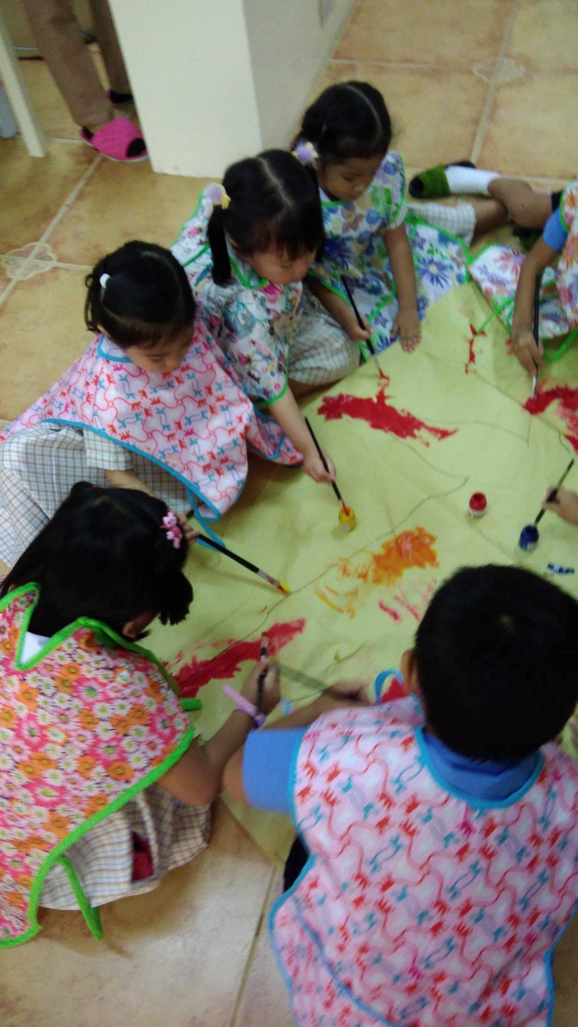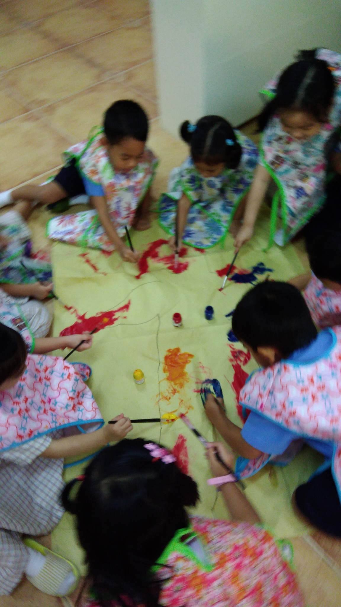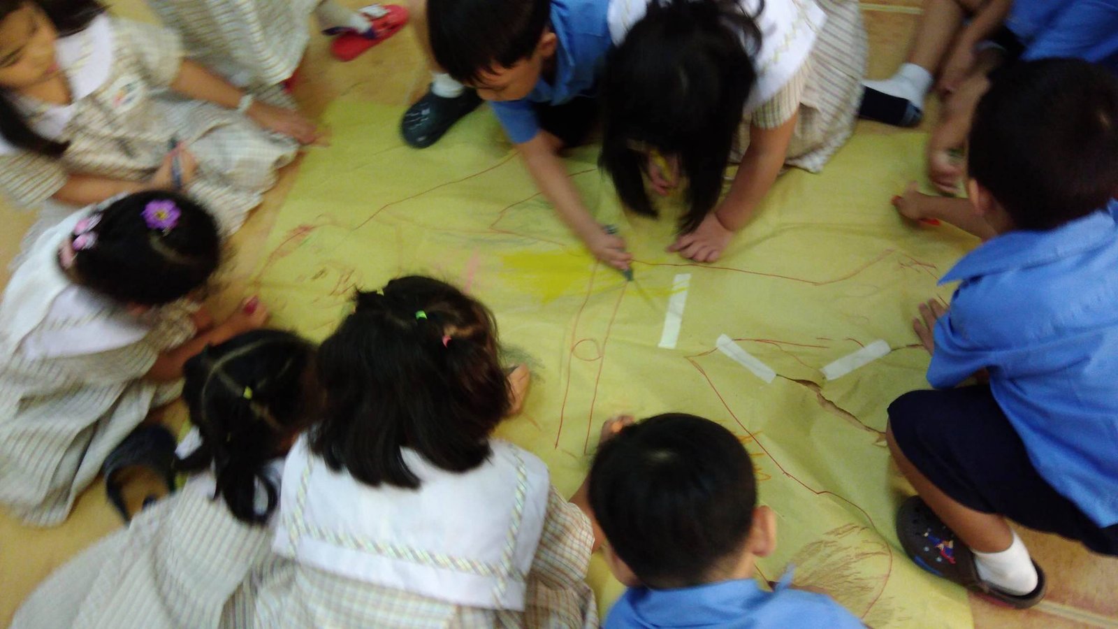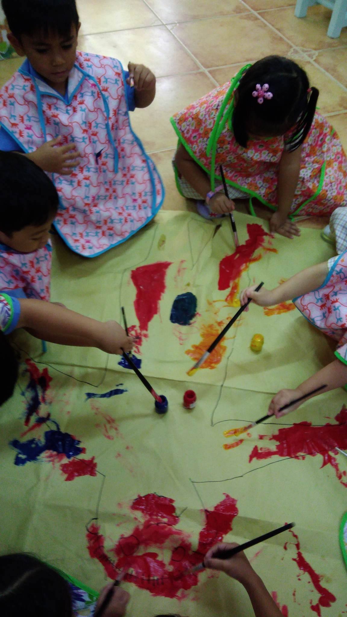 Teacher Aljean intentionally planned the day’s session by giving an interactive learner-centered activity on the concept of “Parts of the Body”. She made use of blank manila papers, markers and other coloring materials. She grouped the class and with her assistance, each group traced the actual body of a specific member. After the body has been traced, the group drew and named its parts according to how they see it in their classmate’s body.