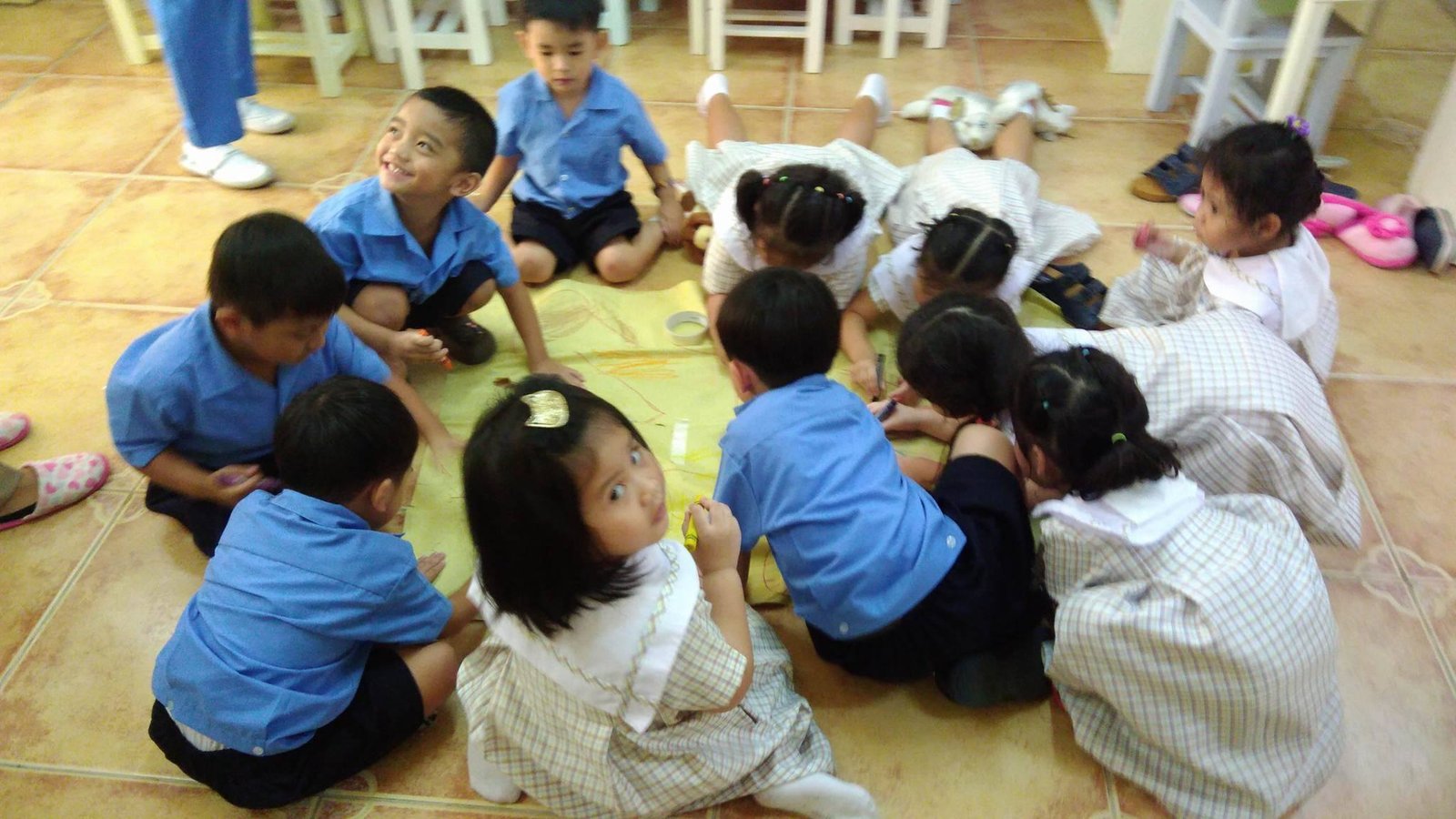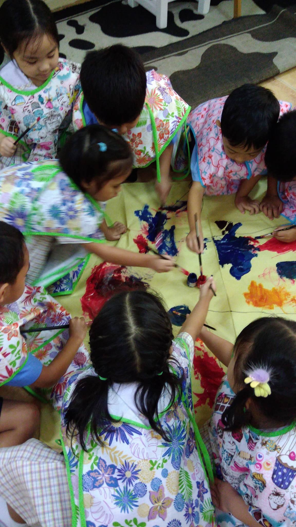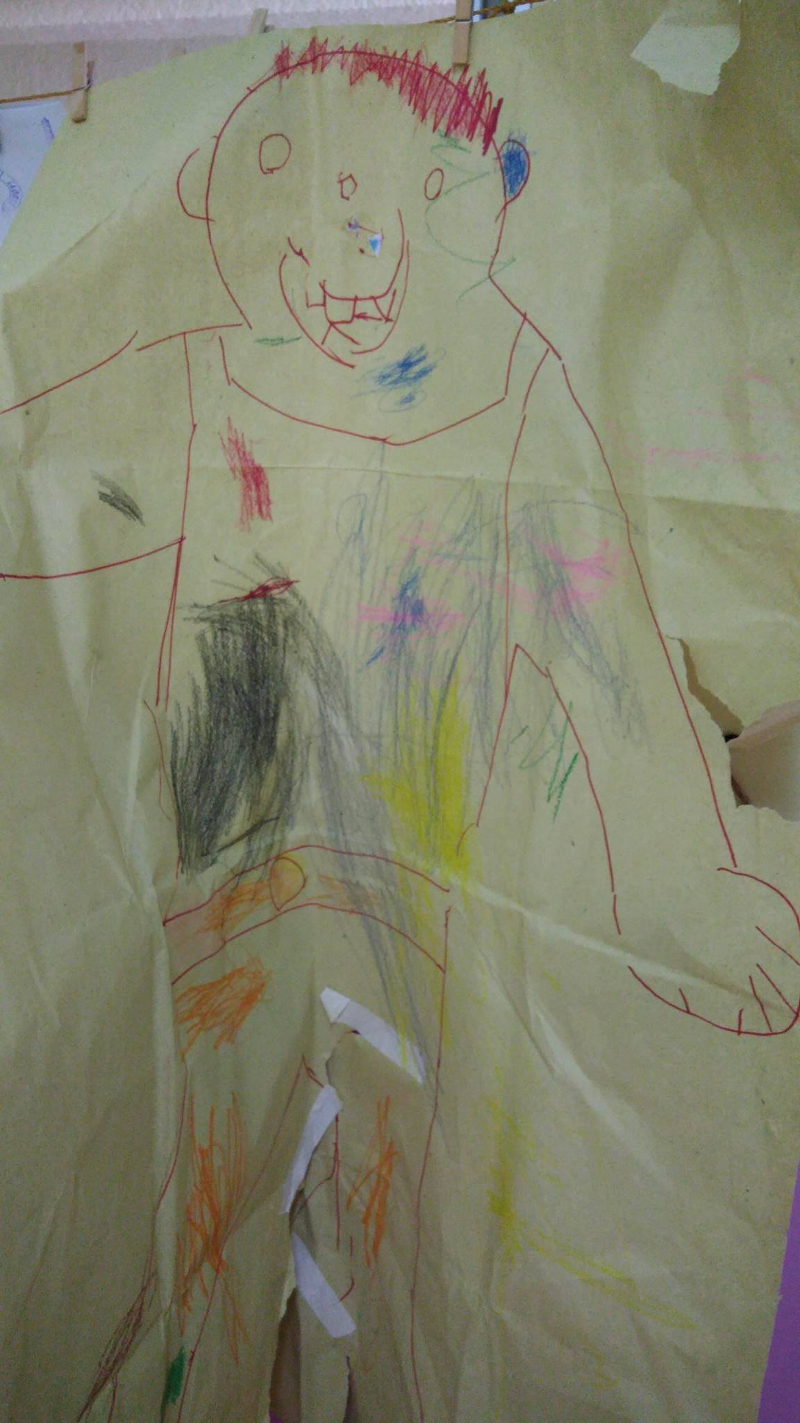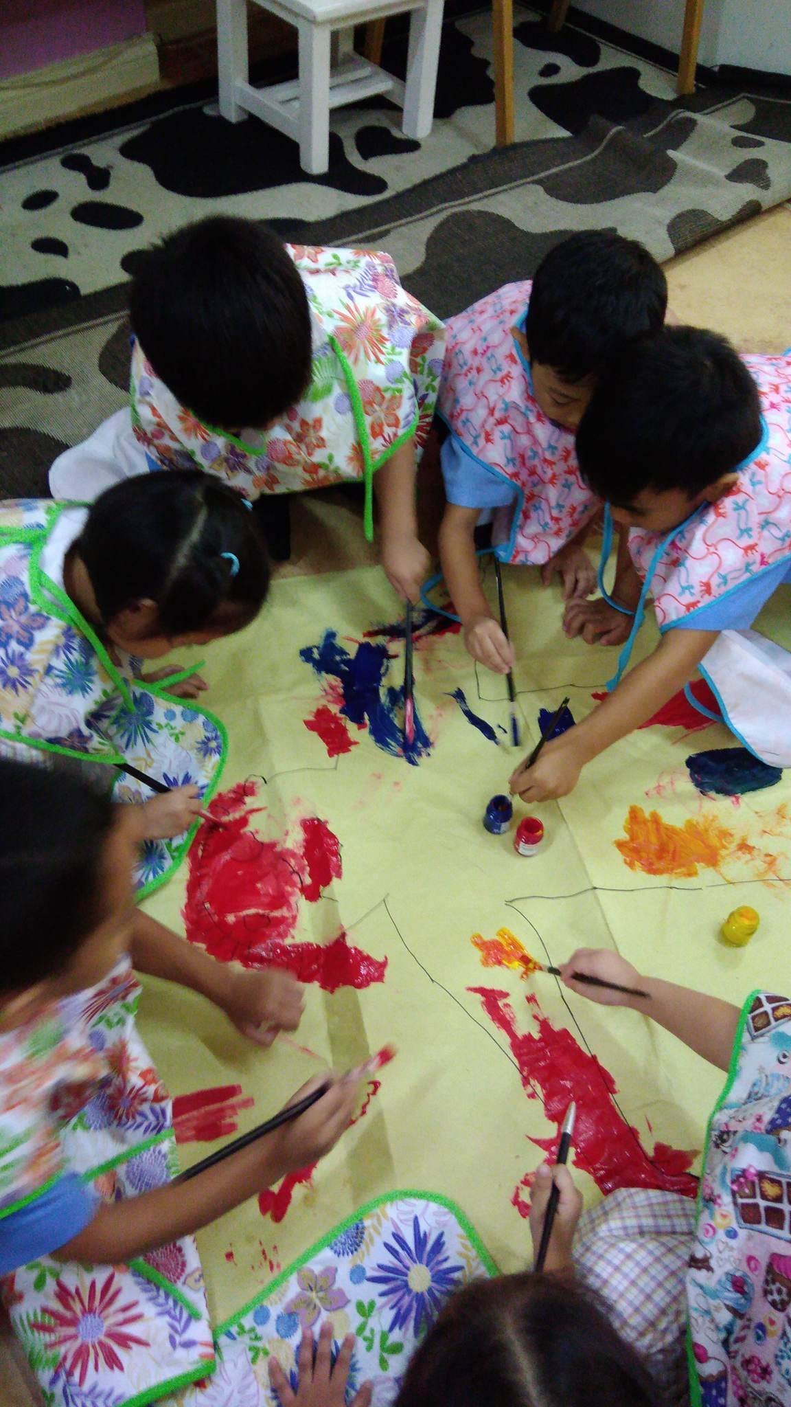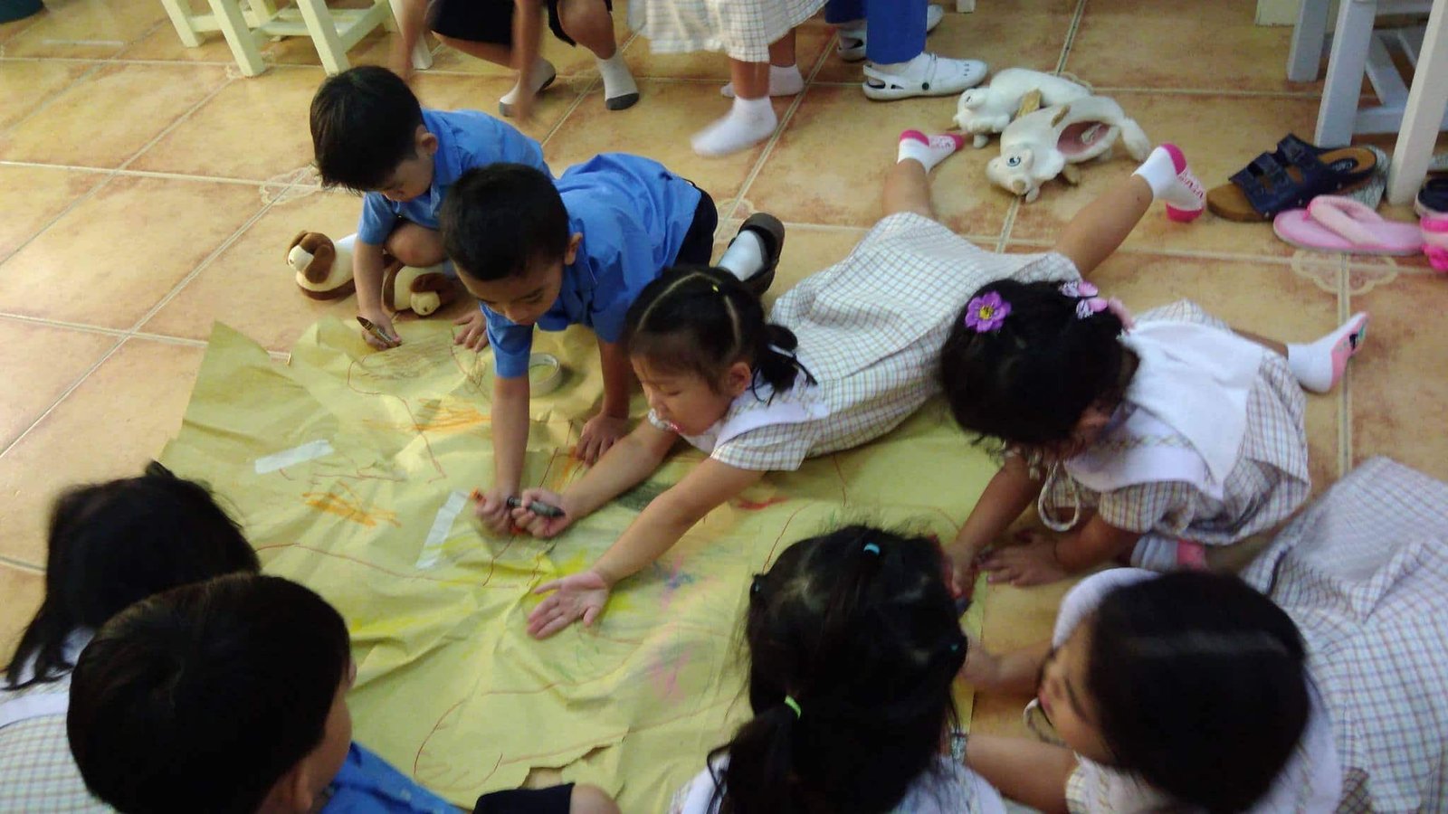 Teacher Aljean intentionally planned the day’s session by giving an interactive learner-centered activity on the concept of “Parts of the Body”. She made use of blank manila papers, markers and other coloring materials. She grouped the class and with her assistance, each group traced the actual body of a specific member. After the body has been traced, the group drew and named its parts according to how they see it in their classmate’s body.