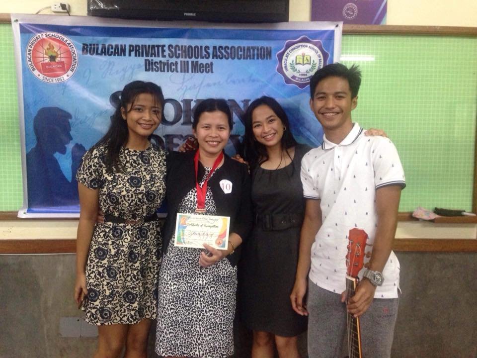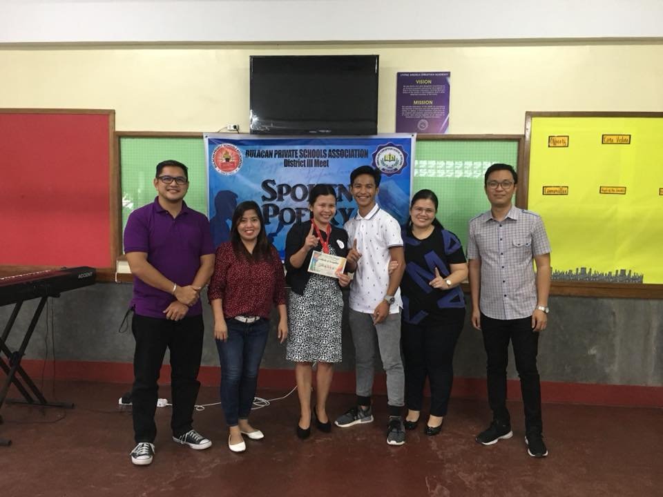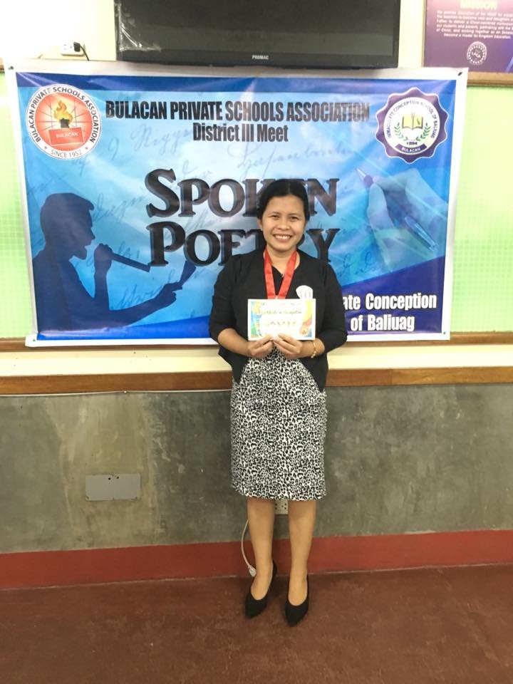 Sa kabila ng kakulangan sa oras at panahon sa paghahanda, nagawa pa ring mamayagpag ni Bb. Roan Estay, guro sa Montessori De Sagrada Familia (MDSF) matapos maiuwi ang gintong medalya sa Spoken Poetry Event (Faculty Level) sa Bulacan Private Schools Association (BulPriSA) na ginanap sa Living Angels Christian Academy, Baliwag, Bulacan, Setyembre 19.