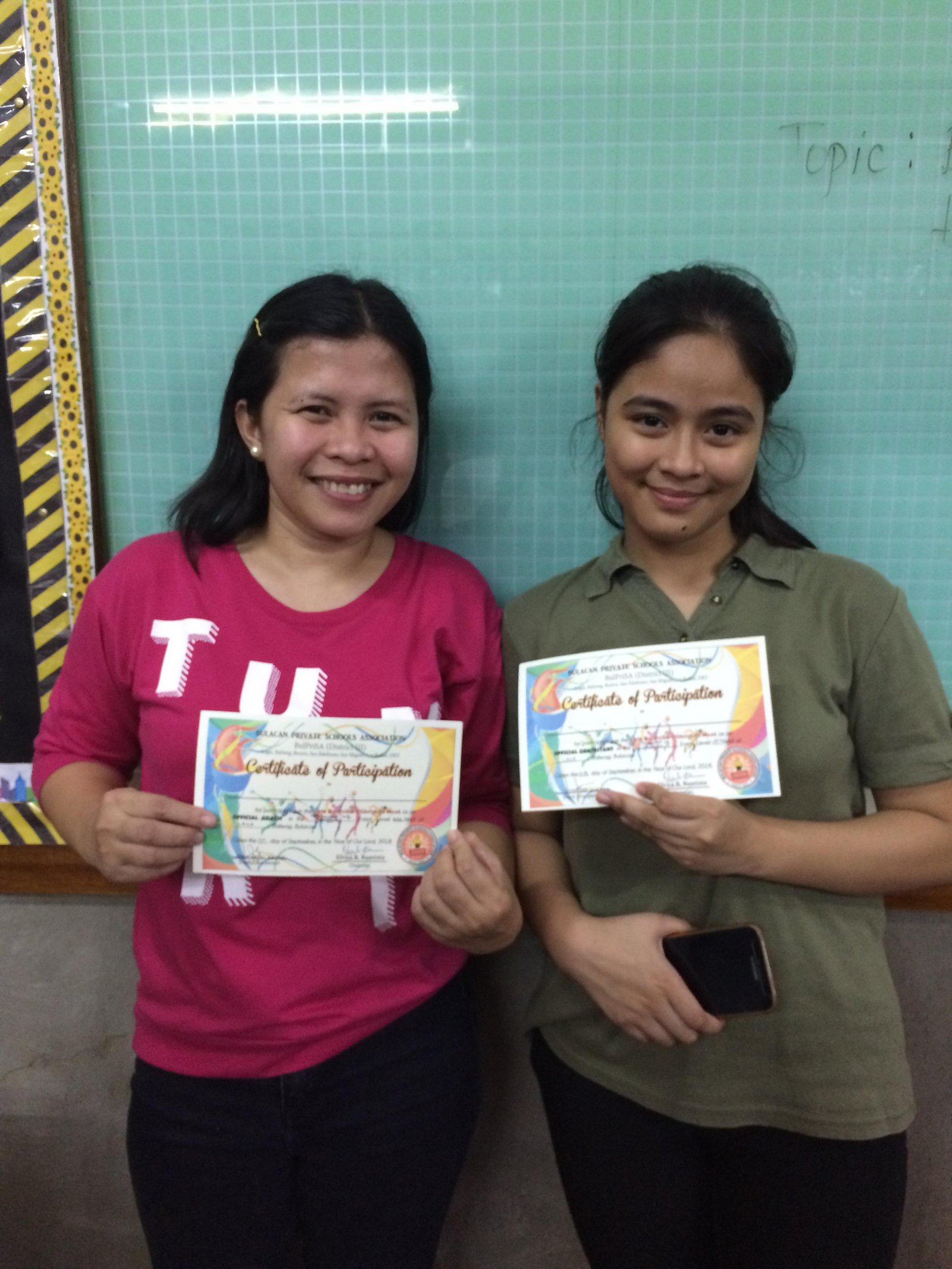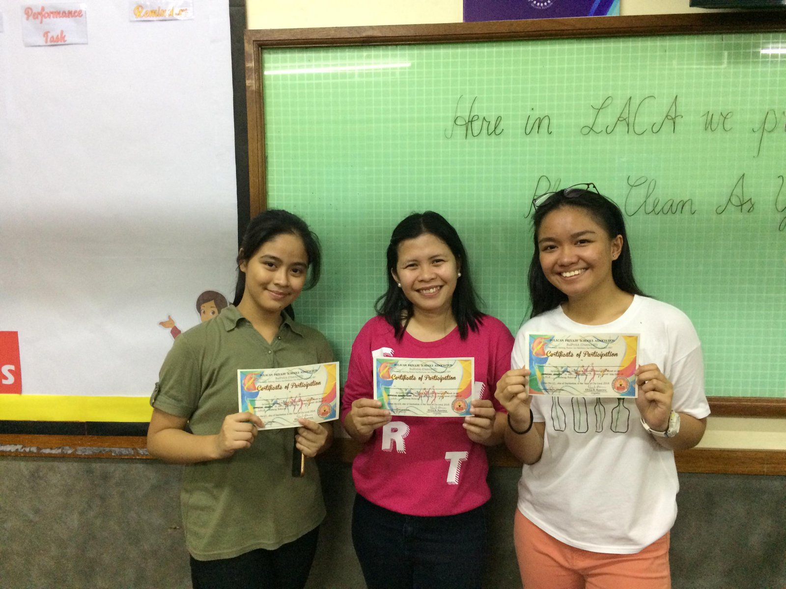 Nagwagi si Shandria Fangon sa paligsahan ng Pagsulat ng Sanaysay na naganap sa Living Angels Christian Academy (LACA) bunga ng kanyang pagsasakripisiyo at dedikasyon.