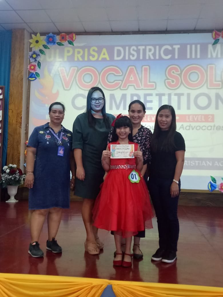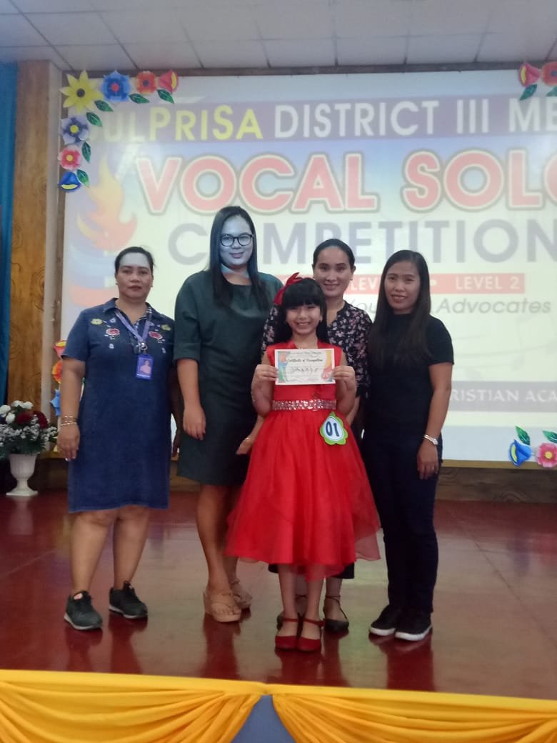 Akiesha Nicole R.Singh, a Grade Two pupil rendered a performance worthy of winning a spot in the upcoming Provincial Meet, after bagging 1st place (Vocal Solo) in the recently concluded Bulacan Private Schools’ Association (BulPriSA) District Meet, Sept.19.