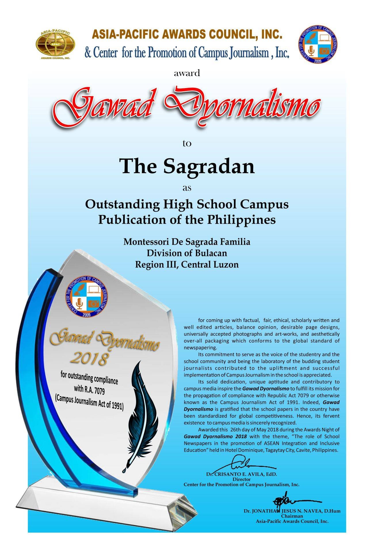 Armed with its mighty pen, The Sagradan grabbed the spot as one of the best student publications in the Philippines during the 2018 Gawad Dyornalismo of the Asia-Pacific Awards Council, Inc. & Center for the Promotion of Campus Journalism, Inc. last May 26 at Hotel Dominique, Tagaytay City.