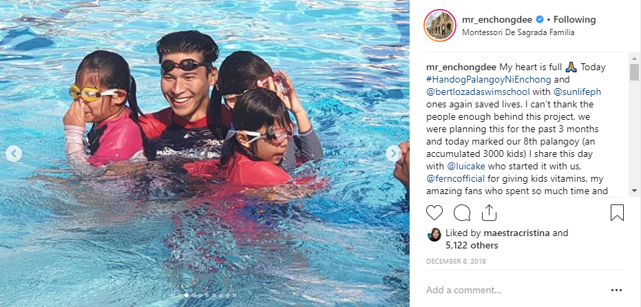 Kapamilya Actor and swimmer, Enchong Dee, continues to help indigent children through his “Handog Palangoy ni Enchong” project by teaching them basic swimming lesson and water safety education.