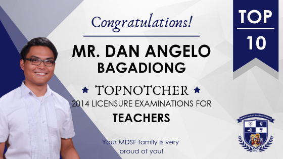 Mr. Angelo Bagadiong, a science teacher in the elementary department passed the Licensure Examinations for Teachers (LET) last 2014 as top 10 among thousands of examinees.