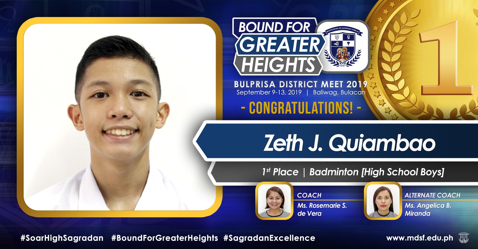 Palarong Pambansa gold medalist Zeth Quiambao stood tall at the bigger stage after concluding his debut in high school on a strong note, subduing Saint Jean Baptiste Academy’s (SJBA) Joshmetric Salonga, 21-10, 21-6, in the championship match of Singles 2 event.