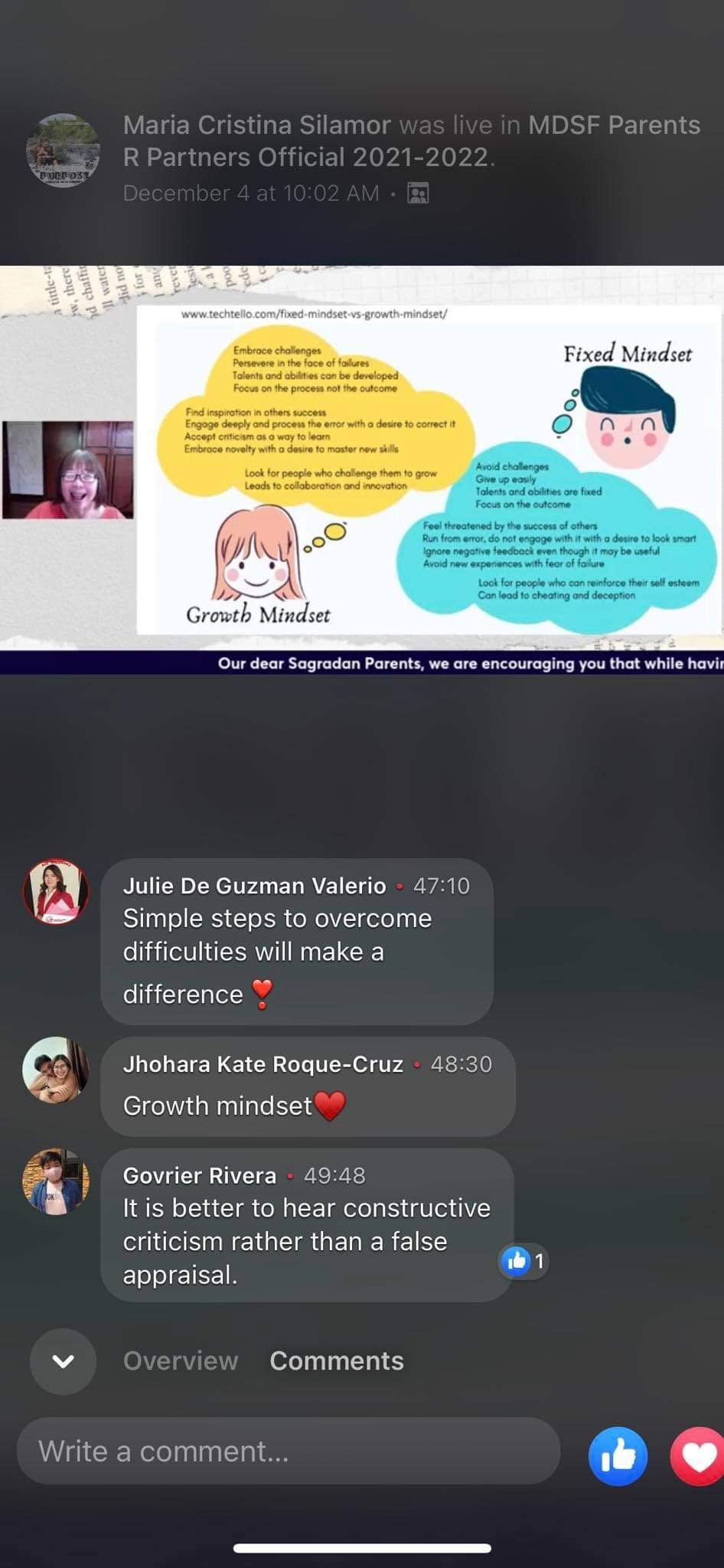 General comments like this poured into the comments section of the Facebook Live from the attendees of the webinar with the theme “Building Resilience in Children and Teens” sponsored by Montessori De Sagrada Familia, Inc. (MDSF), December 4.
